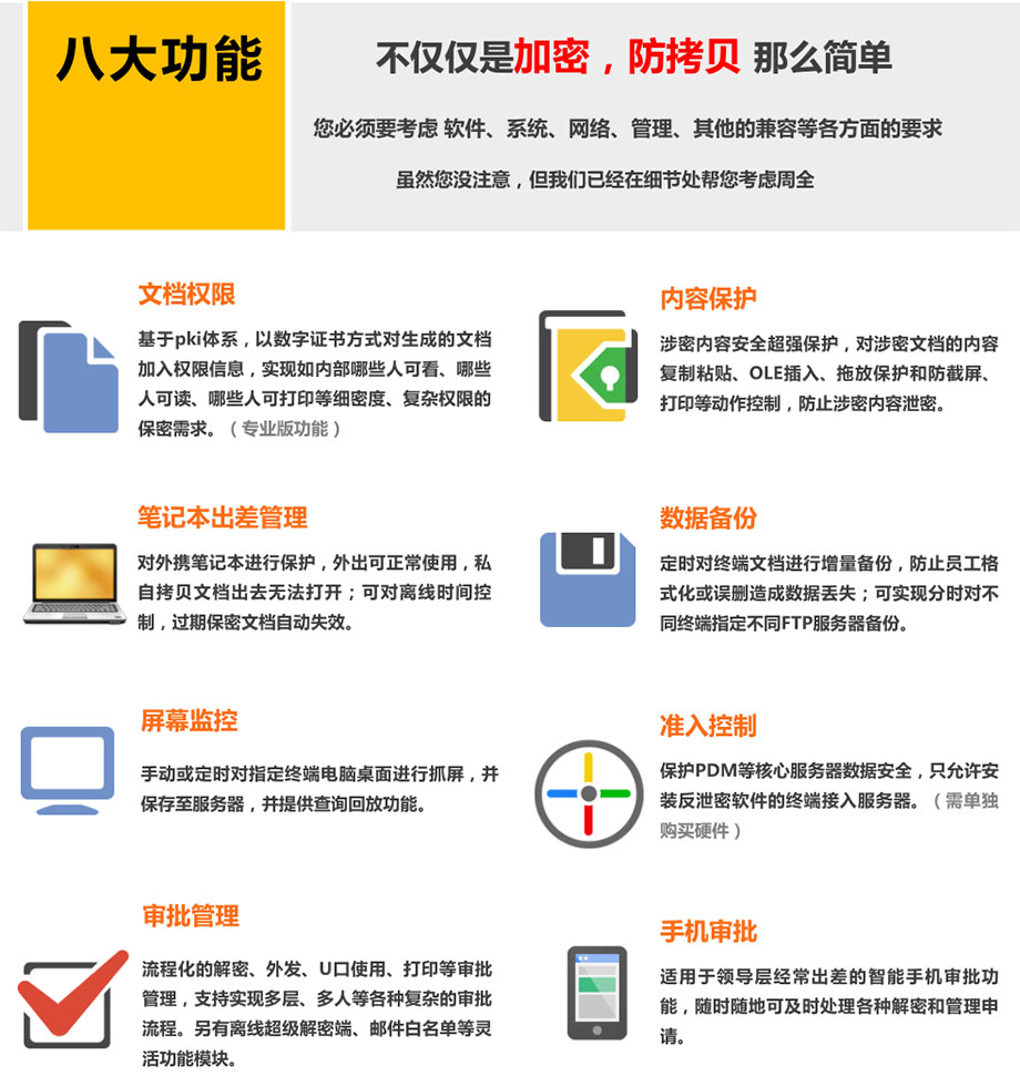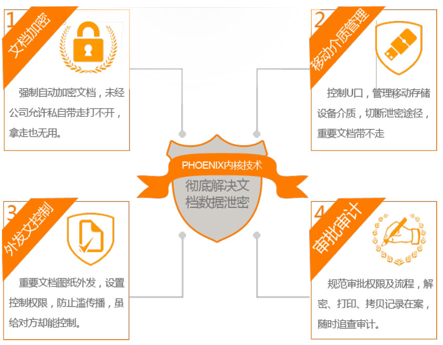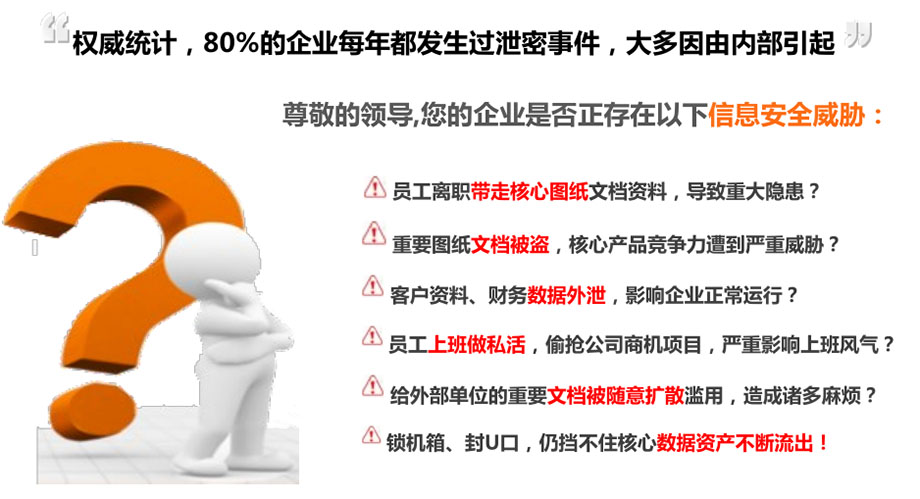 加密系統(tǒng)集身份認(rèn)證與權(quán)限管理、U盤管控、打印控制、程序控制、日志監(jiān)控、自動備份、外發(fā)文件控制等多功能模塊于一體的反商業(yè)泄密系統(tǒng)軟件,是國內(nèi)最先進(jìn)、最穩(wěn)定、最安全的解決信息安全泄密問題的方案。